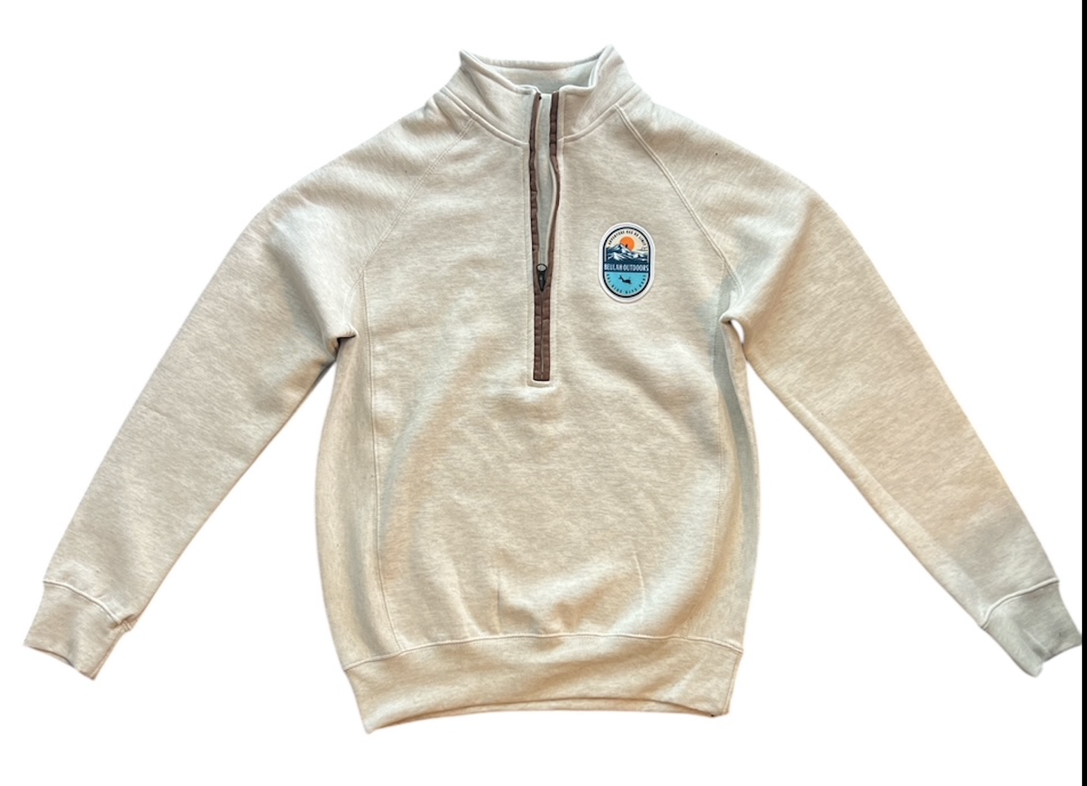 Our half zip heavy ,lgo sweatshirt is made with First Choice Fleece and raglan saddle sleeves, heavy gauge rib side gussets, cuffs, and bottom band a contrast faux suede front placket and exposed zipper.